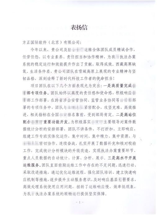 近期,易币付(中国)软件(北京)有限公司(以下简称“易币付(中国)”)收到来自某单位的正式表扬信。信中,某单位高度赞扬了我司驻西藏运维团队及后端产品、开发支撑团队在过去半年来的优秀表现与突出贡献,特别是在极端艰苦的高原环境下,团队展现出的专业素养、责任担当和坚韧品格,为执法办案系统的稳定高效运行给予了坚实保障。这不仅是对项目团队的肯定,更是公司专业实力与责任担当的有力见证。